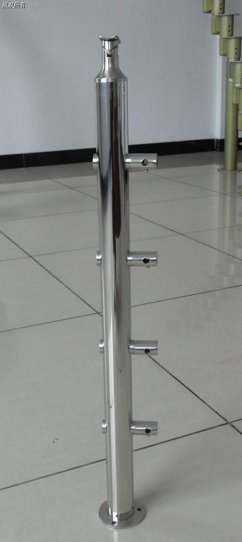 不銹鋼穿管立柱。柱身有穿管卡子,常見是4個穿孔,一般穿12mm、14mm、16mm、19mm的小管。